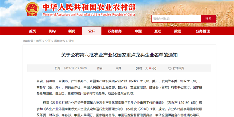 12月3日,农业农村部、国家发展改革委、财政部、商务部、中国人民银行、国家税务总局、中国证券监督管理委员会、中华全国供销合作总社联合印发通知,公布第六批 299 家农业产业化国家重点龙头企业名单,龙江开云手机在线官网入口-开云(中国)公司榜上有名。